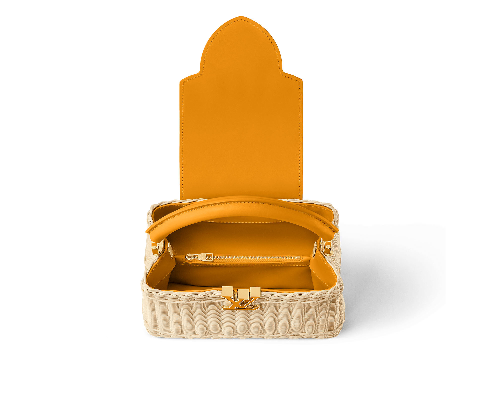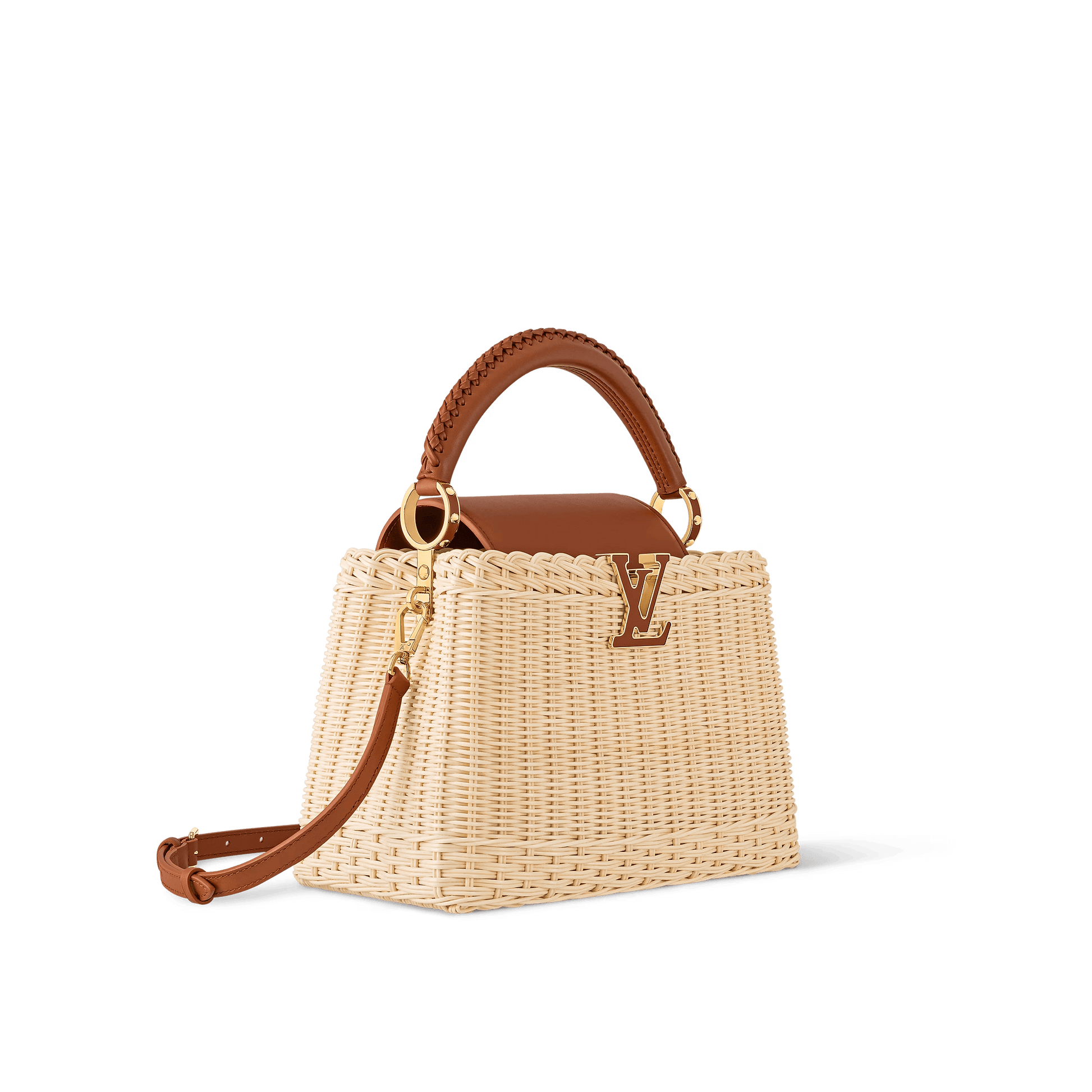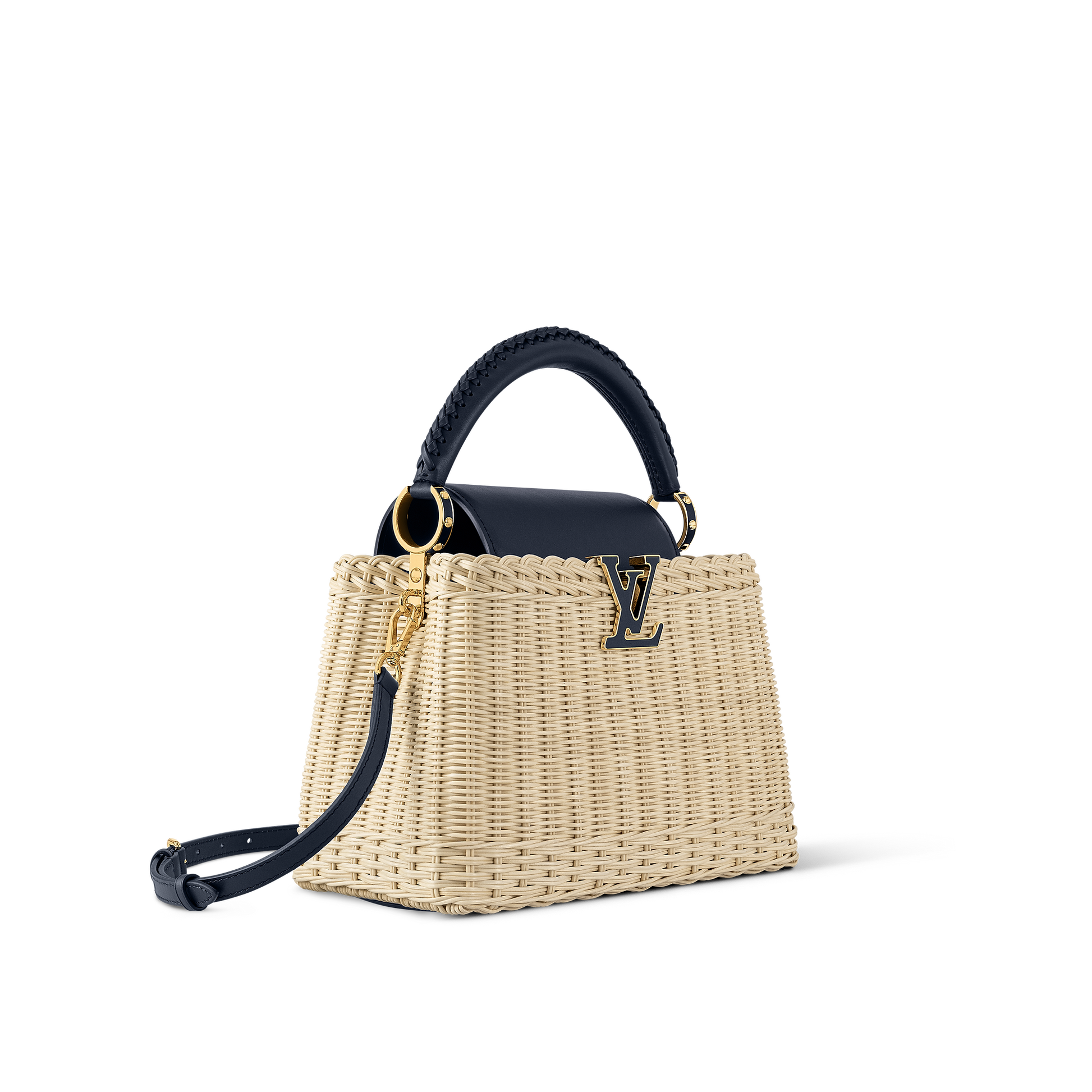 This Capucines BB is meticulously handwoven from rattan, with each one-of-a-kind design taking two days to complete. Lending a resort-inspired aesthetic, it is evocative of the House’s Picnic Trunk from 1892 and opens to reveal a patterned lining. It can be worn with the flap styled inside or out, and is sized to fit everyday essentials. The signature LV Initials add the final flourish.