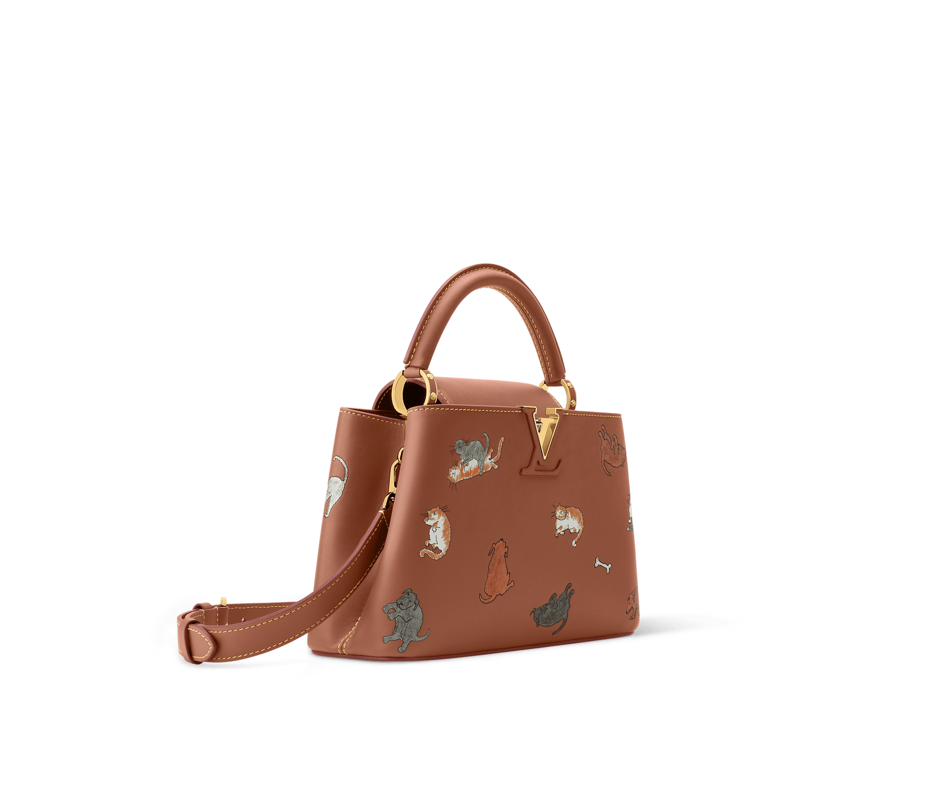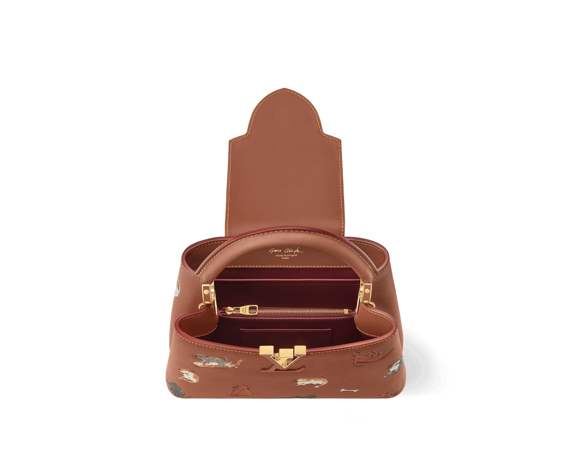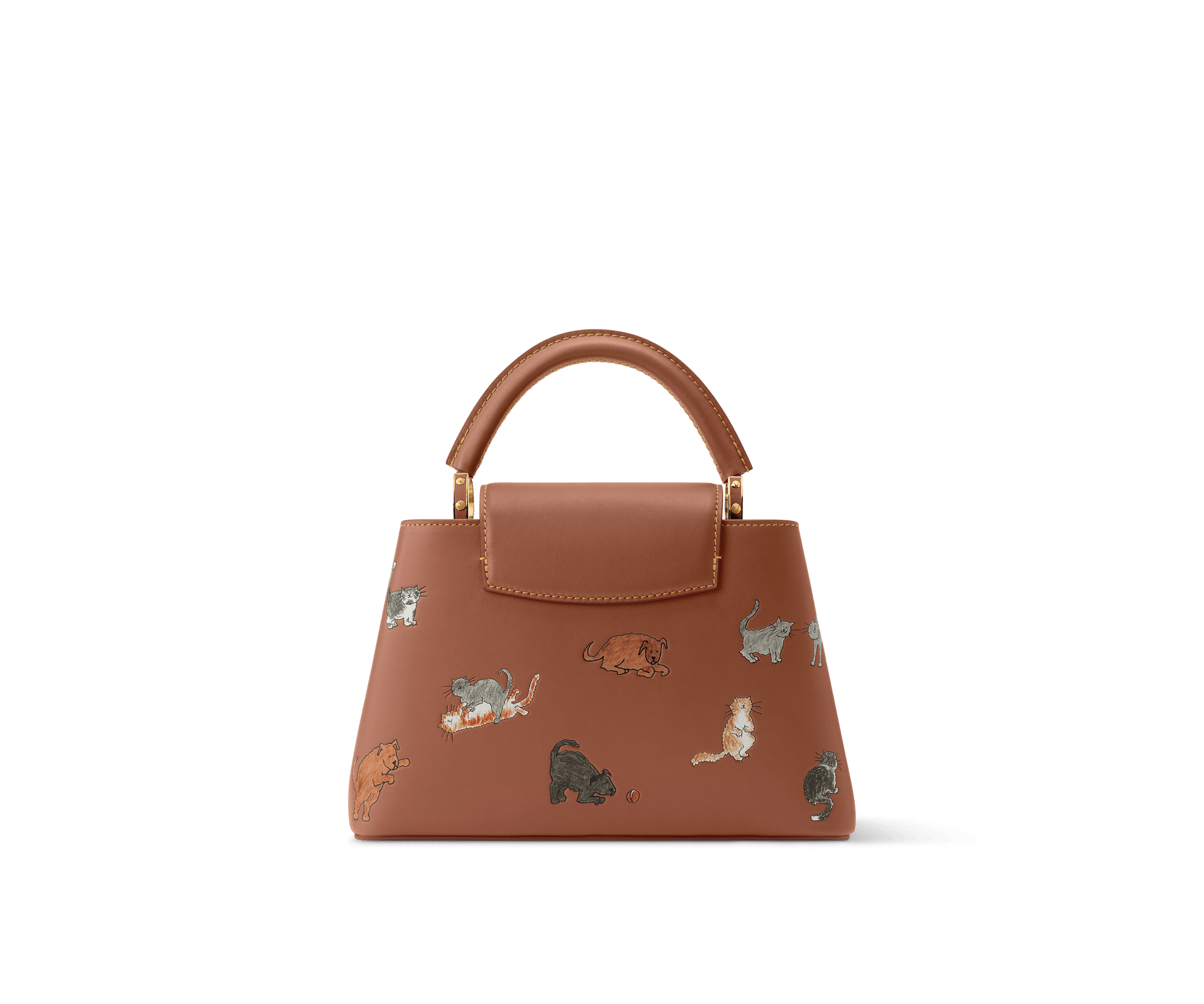 The LV Travels With collection presents the iconic Capucines BB in a timeless Tan colorway, playfully detailed with hand-drawn cat illustrations by fashion icon and artist Grace Coddington. This re-edition from the original 2019 collaboration is crafted from cowhide adorned with gold-toned LV Initials, and can be styled with the flap on the inside or outside. The longer strap can be removed if desired, offering multiple carry options.