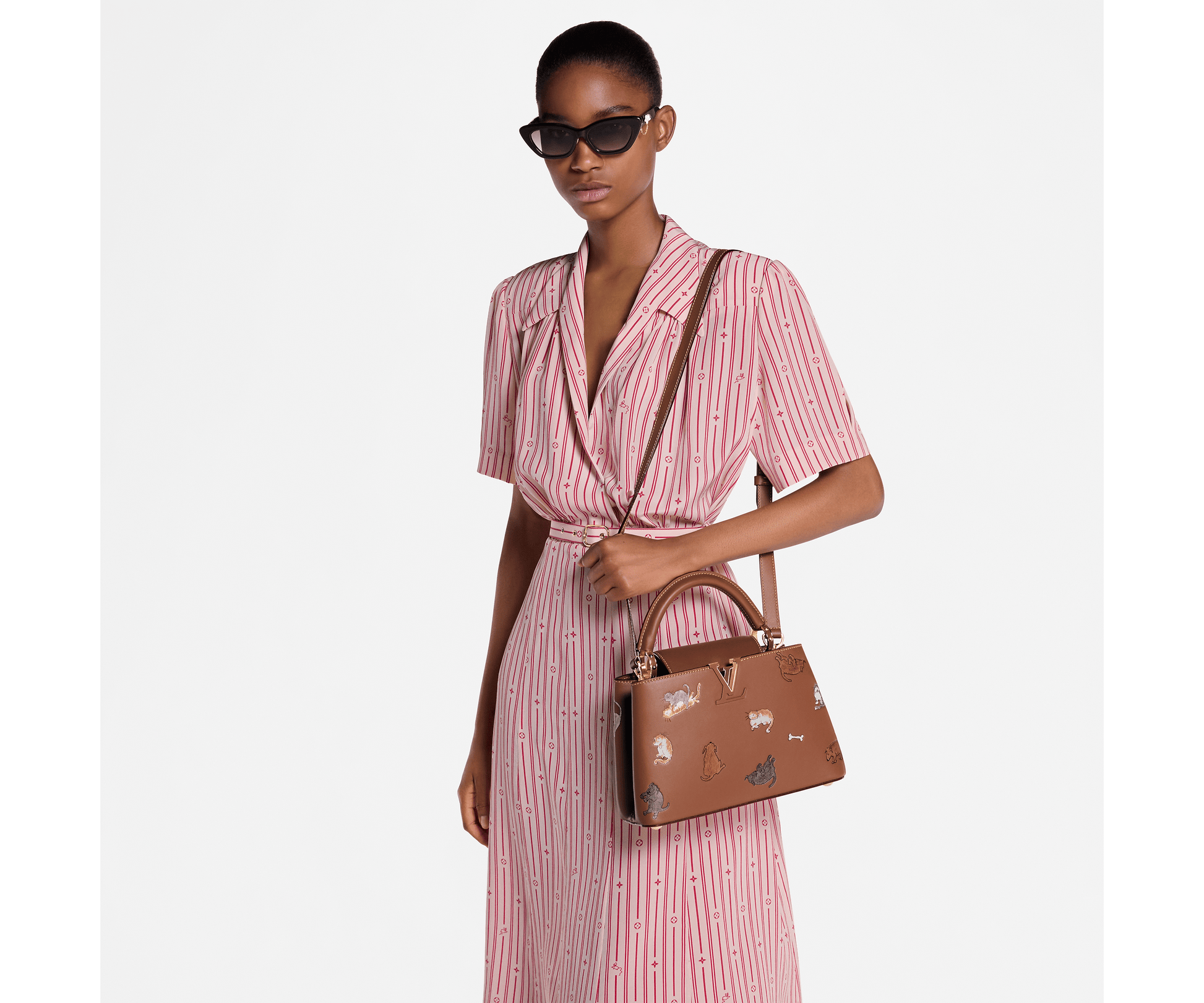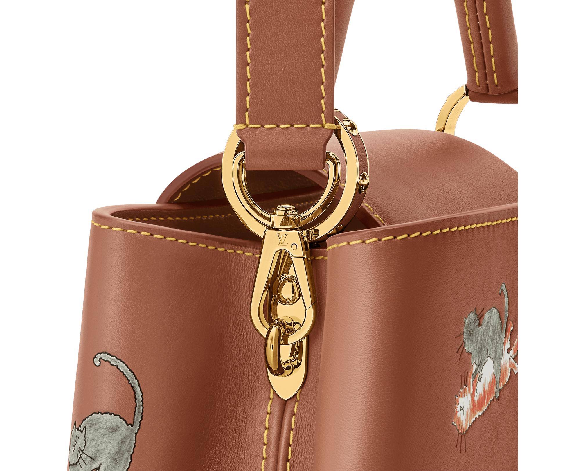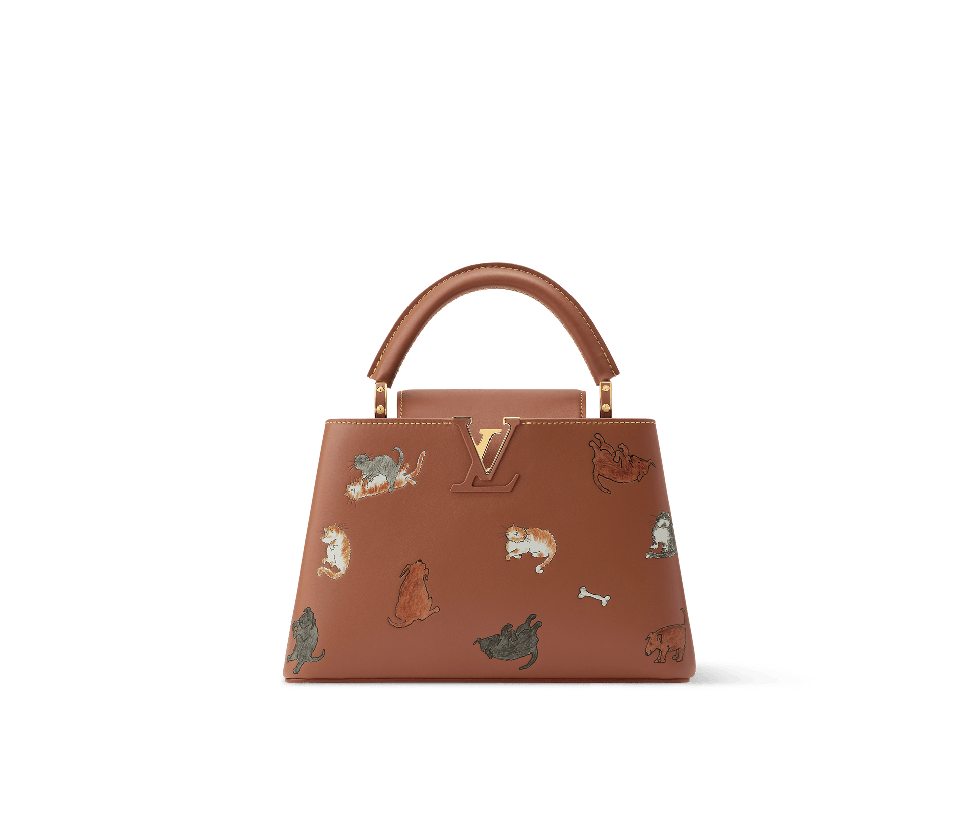 The LV Travels With collection presents the iconic Capucines BB in a timeless Tan colorway, playfully detailed with hand-drawn cat illustrations by fashion icon and artist Grace Coddington. This re-edition from the original 2019 collaboration is crafted from cowhide adorned with gold-toned LV Initials, and can be styled with the flap on the inside or outside. The longer strap can be removed if desired, offering multiple carry options.