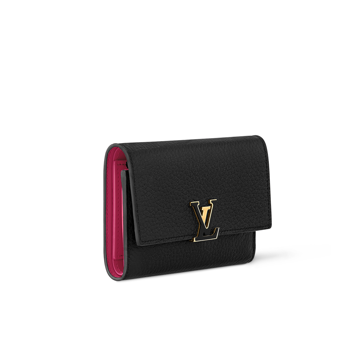 Crafted from supple Taurillon cowhide, the Capucines Compact wallet is practical and can hold a variety of everyday essentials. With its unique and cleverly designed 2-fold design, this elegant wallet has ample space for credit cards, coins and bills.
