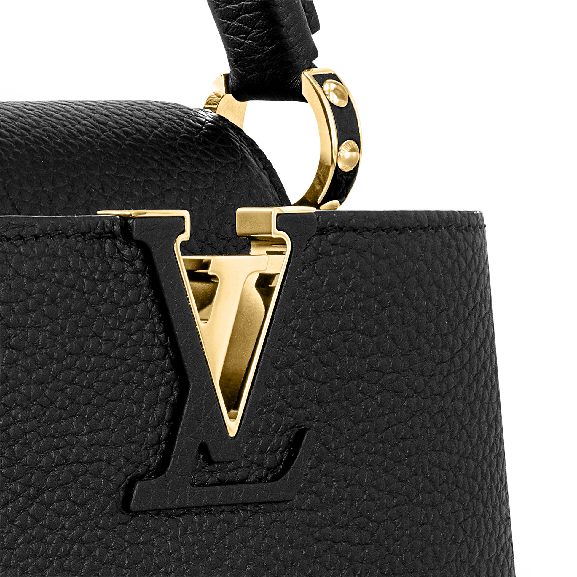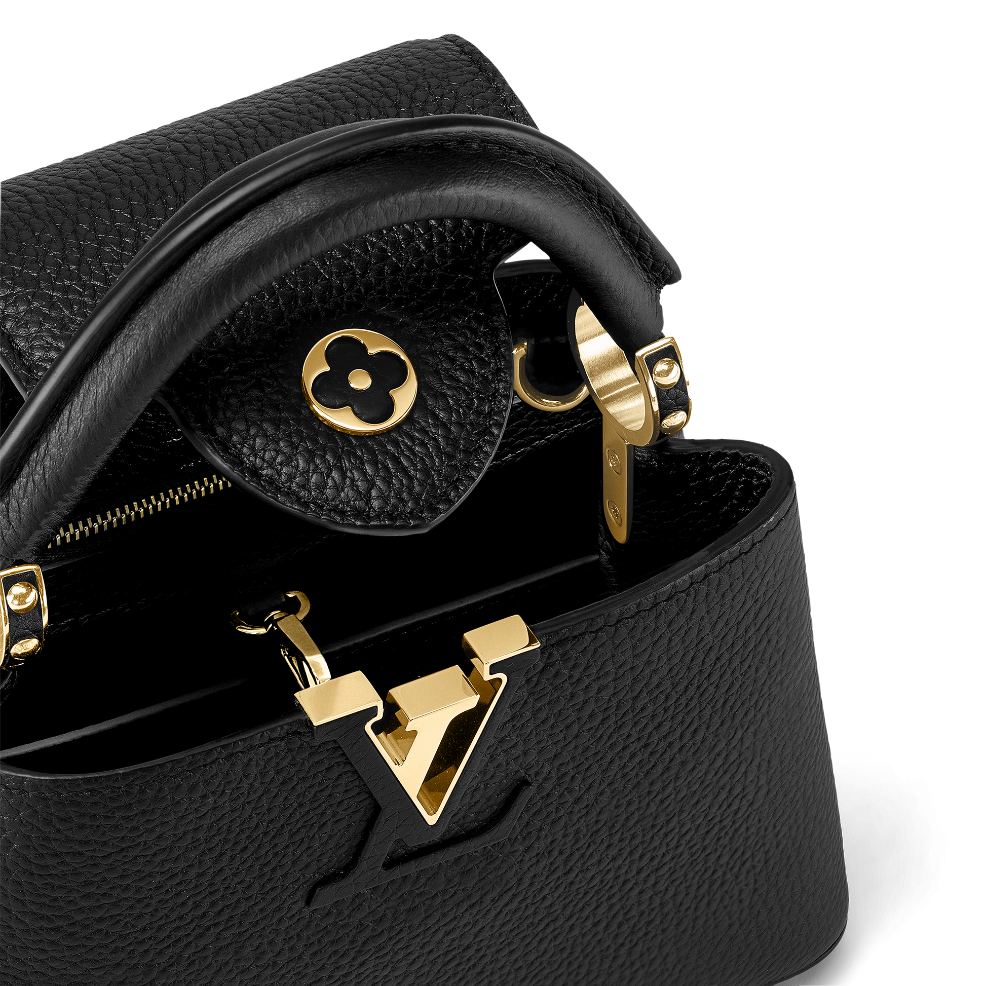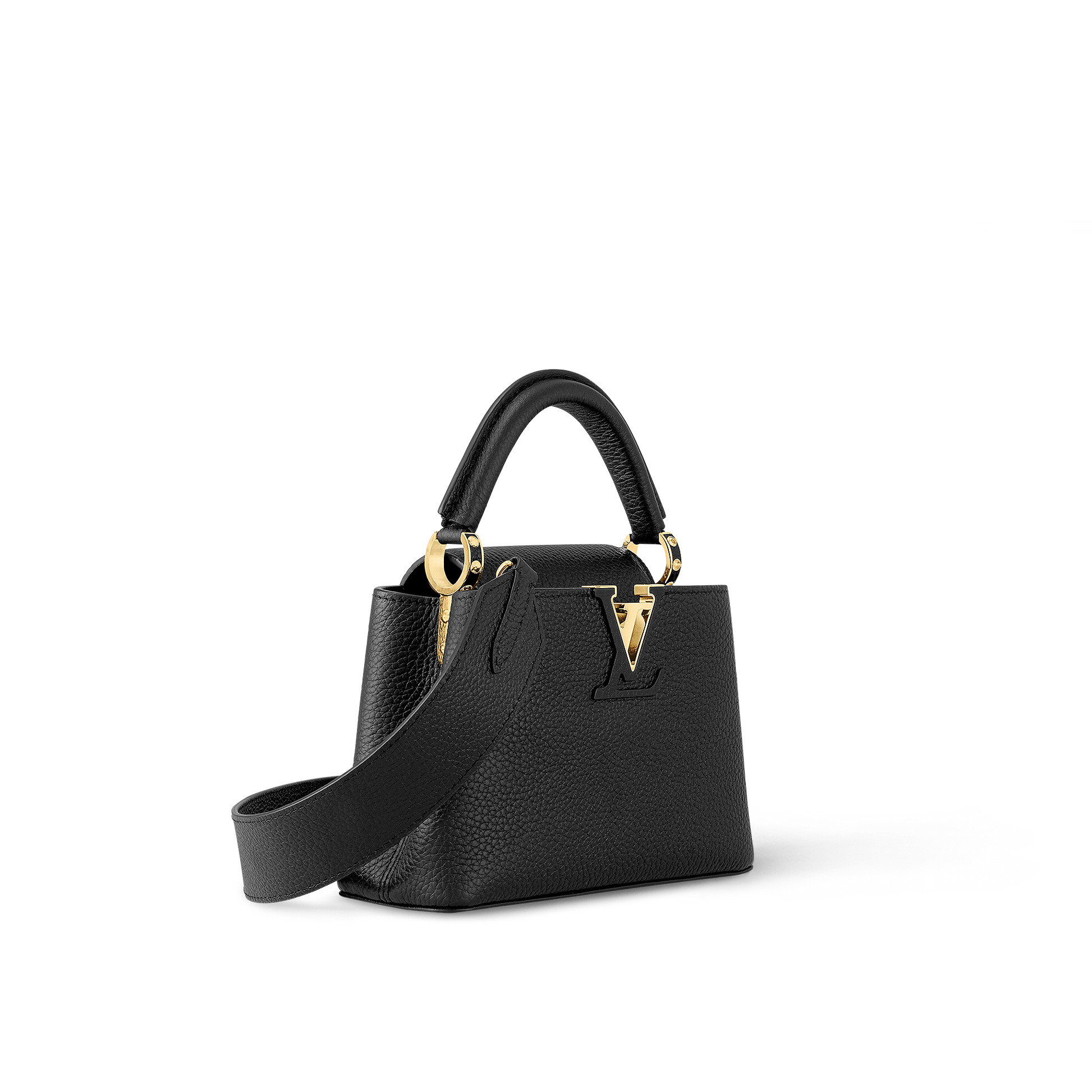 The refined Capucines Mini handbag looks stunningly chic in rich black Taurillon leather finished with golden handle rings and the emblematic LV Initials. This smaller version of the classic Capucines is a pleasure to carry over the shoulder or cross-body thanks to its wide removable strap.