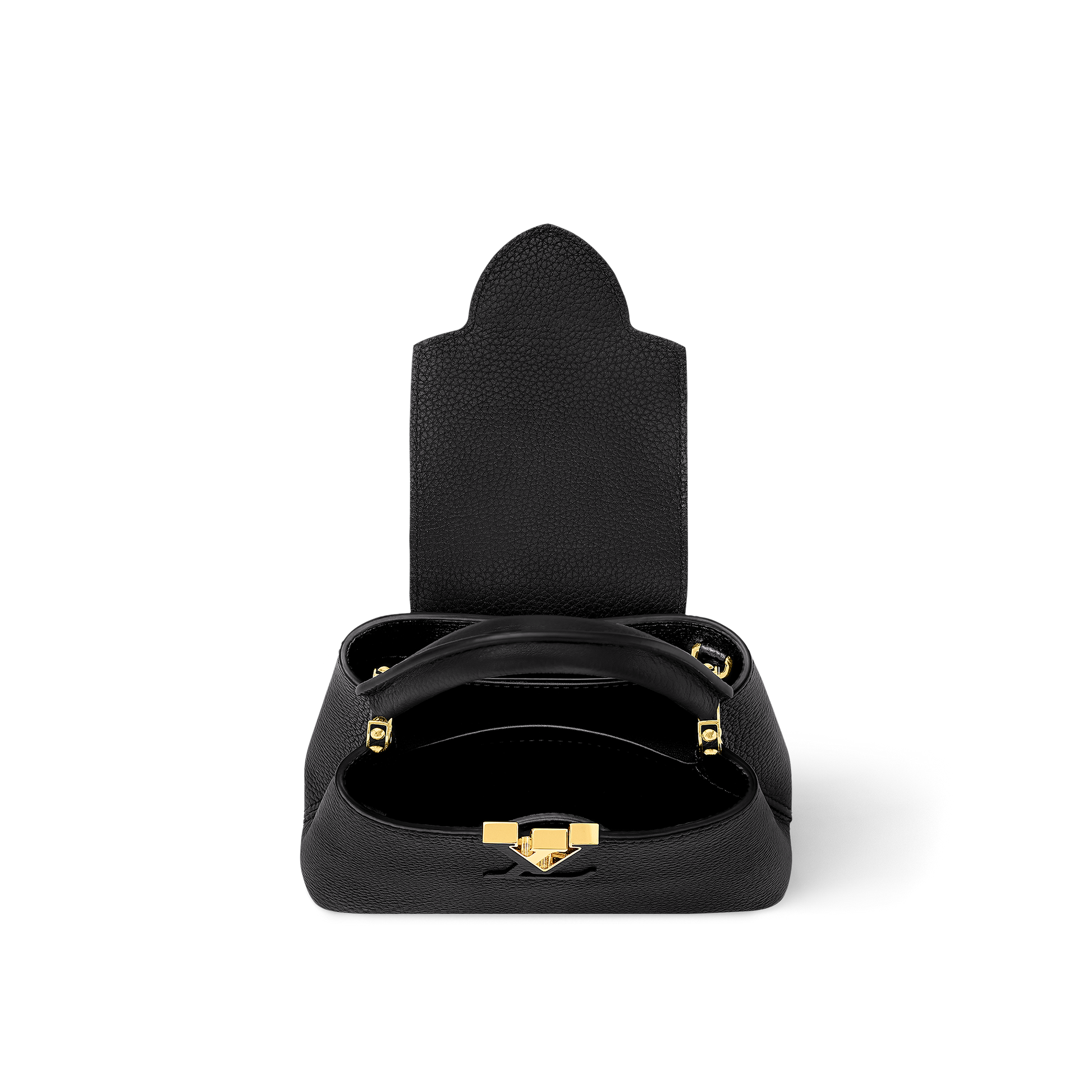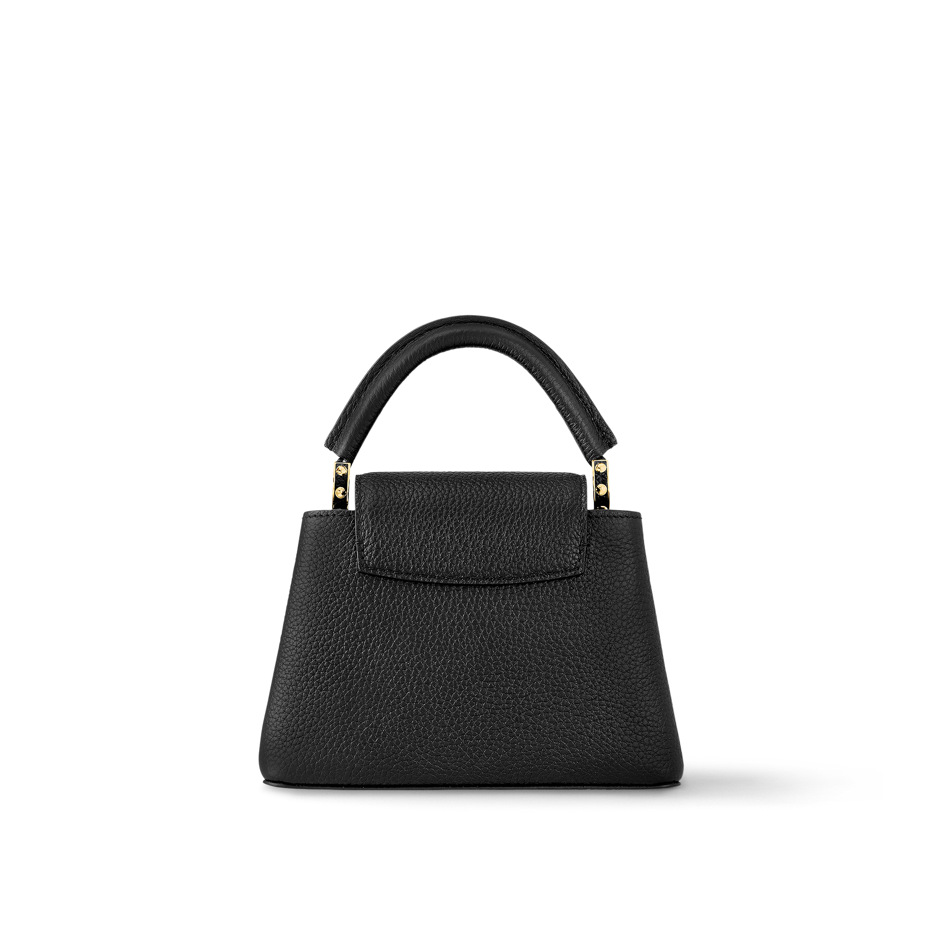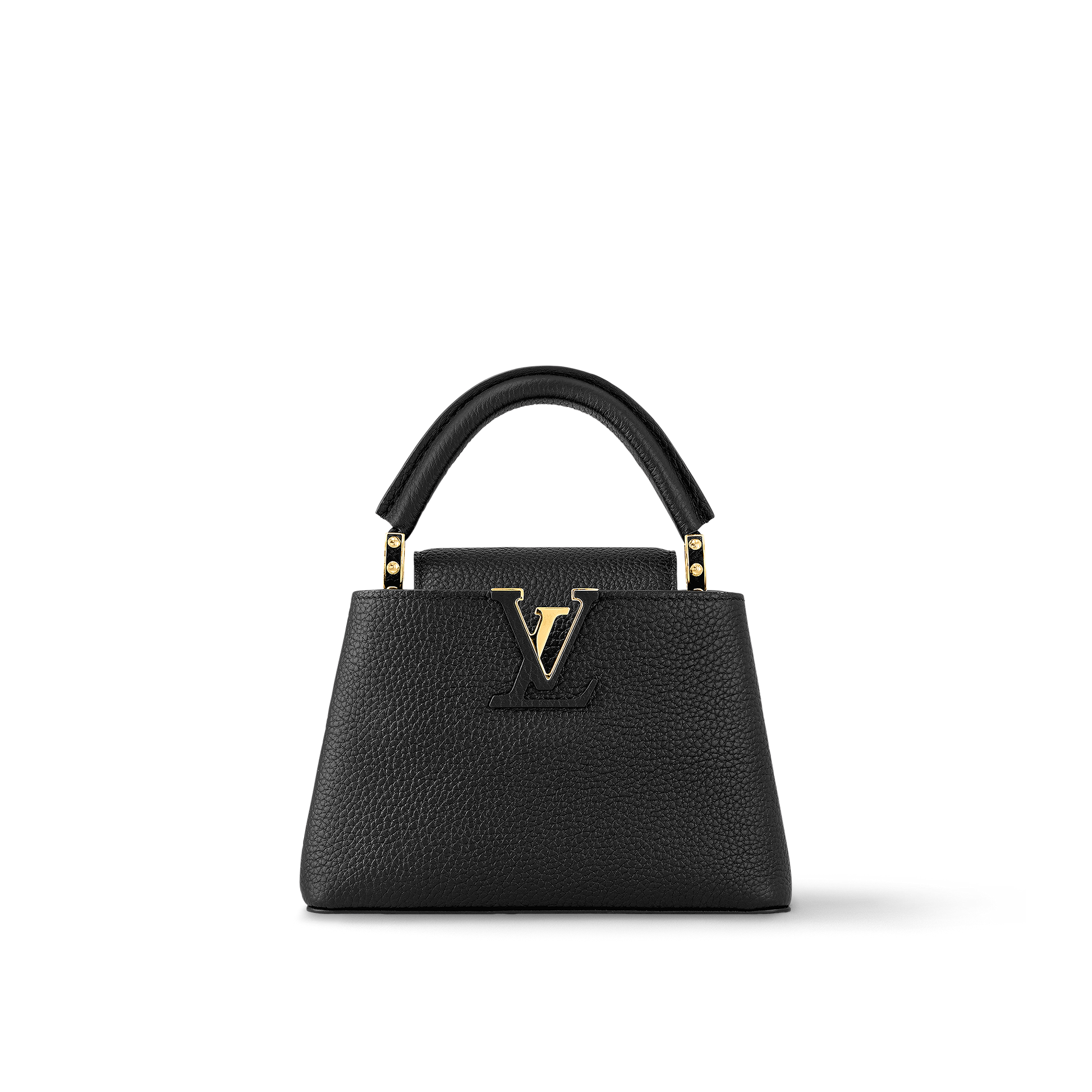 The refined Capucines Mini handbag looks stunningly chic in rich black Taurillon leather finished with golden handle rings and the emblematic LV Initials. This smaller version of the classic Capucines is a pleasure to carry over the shoulder or cross-body thanks to its wide removable strap.
