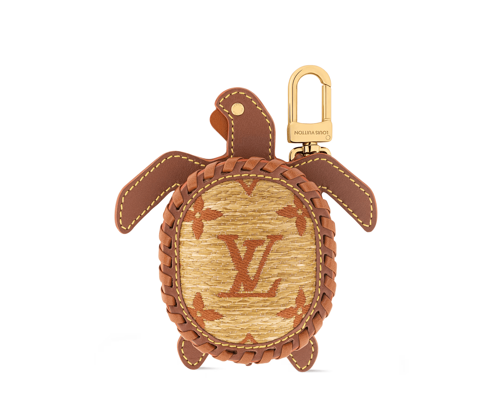 A fun and functional accessory, this turtle-shaped bag charm doubles as a mini pouch. Crafted from Monogram canvas with leather trim, it features Monogram Flower eyes, a gold-tone zip, and an LV-engraved hook for easy attachment to bags or keys.