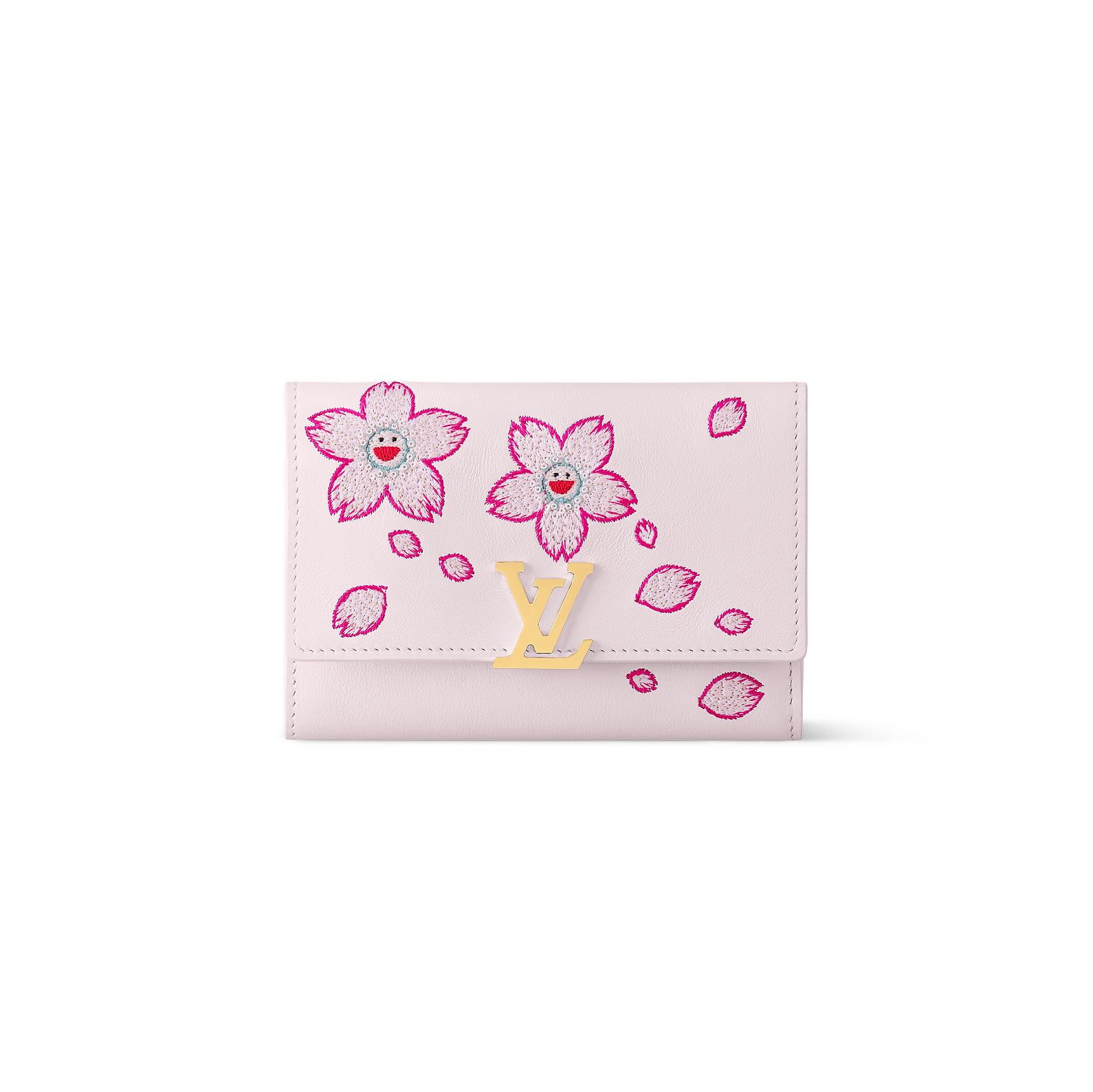 Cheerful codes from the re-edition of the Murakami collection uplift this Capucines wallet. It is crafted from Lambskin leather in a soft shade of pink, which complements the refreshing tones of embroidered Cherry Blossom motifs in the world-renowned Japanese artist’s signature playful style. The snap-button closure is highlighted with golden Initials for a chic House touch. The inside is organized with multiple slots and pockets for cards, bills and coins.