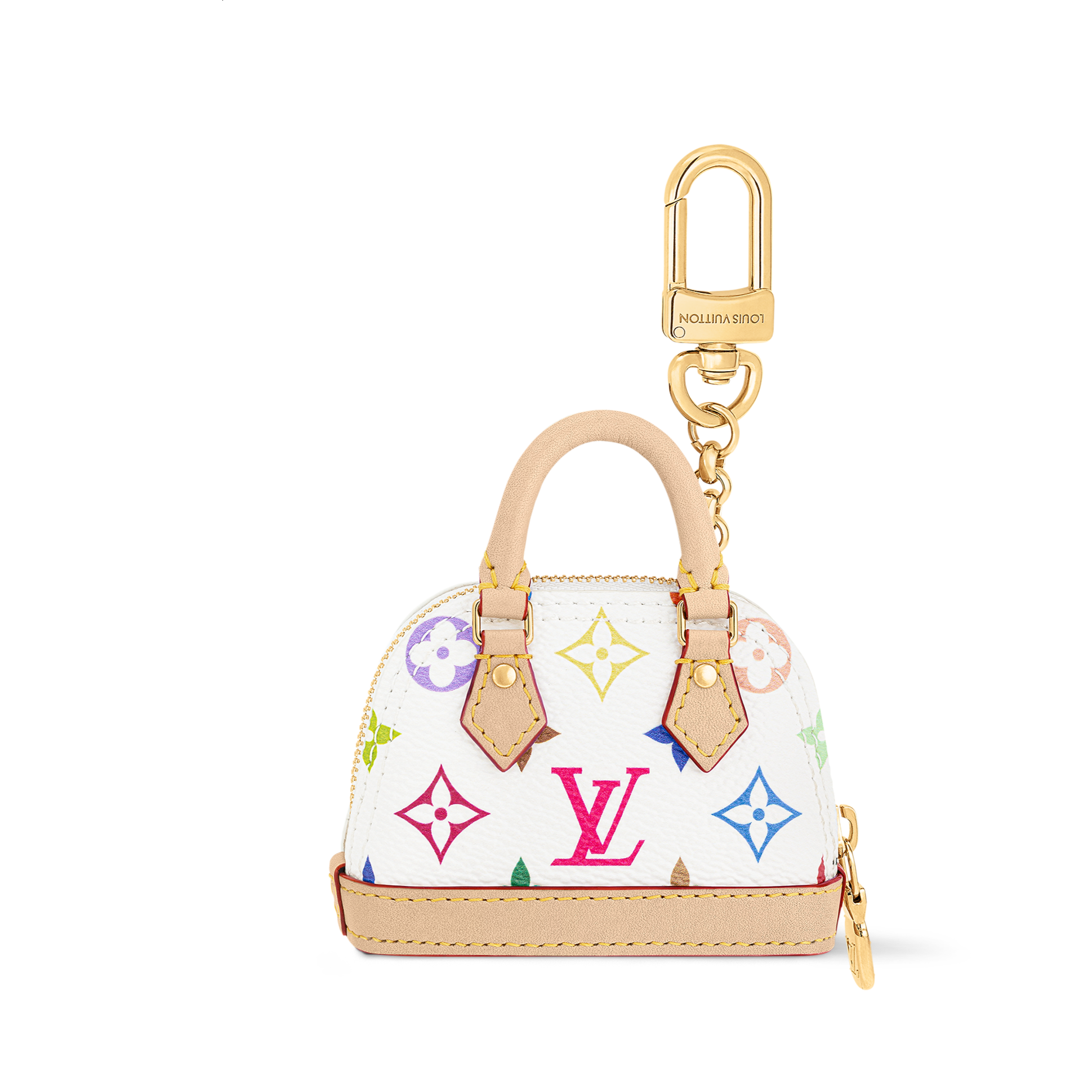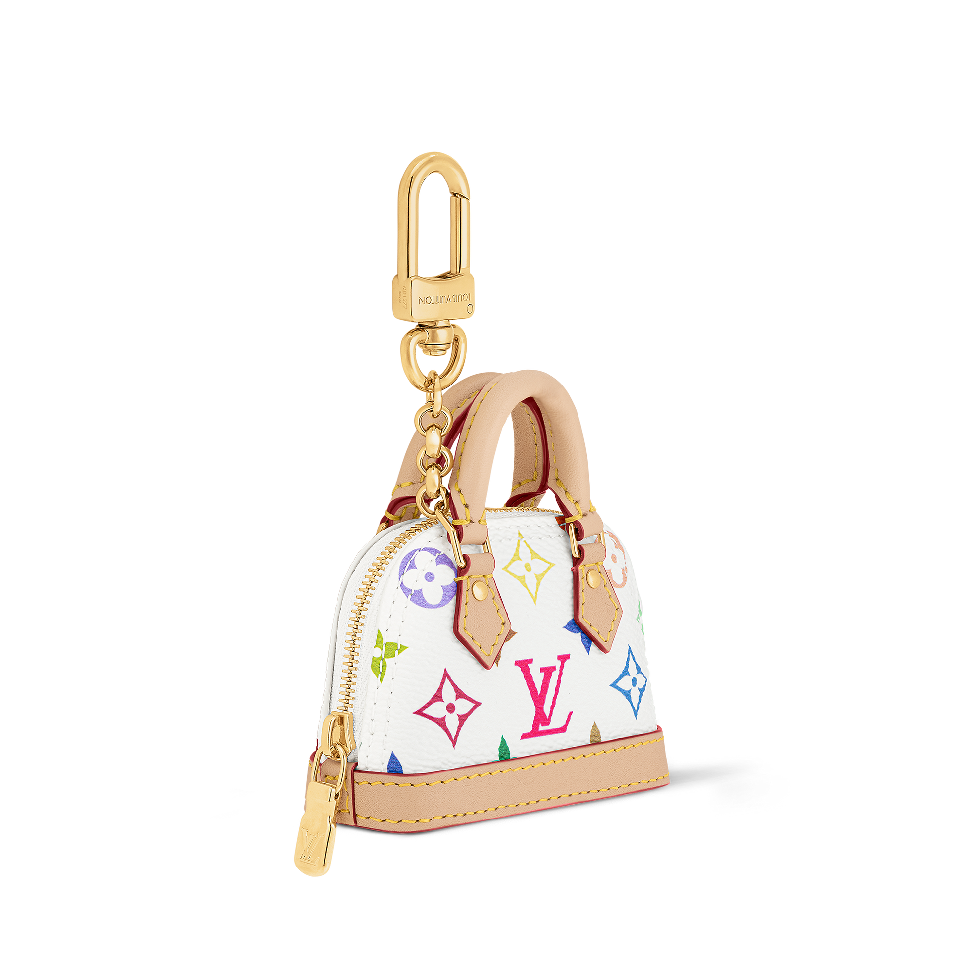Edited in Monogram Multicolor canvas, Murakami’s vibrant take on the House icon, this miniature displays exquisite leather detailing – just like the original. A perfect cache for earphones, it can be attached to belt or bag by the engraved golden snap hook.