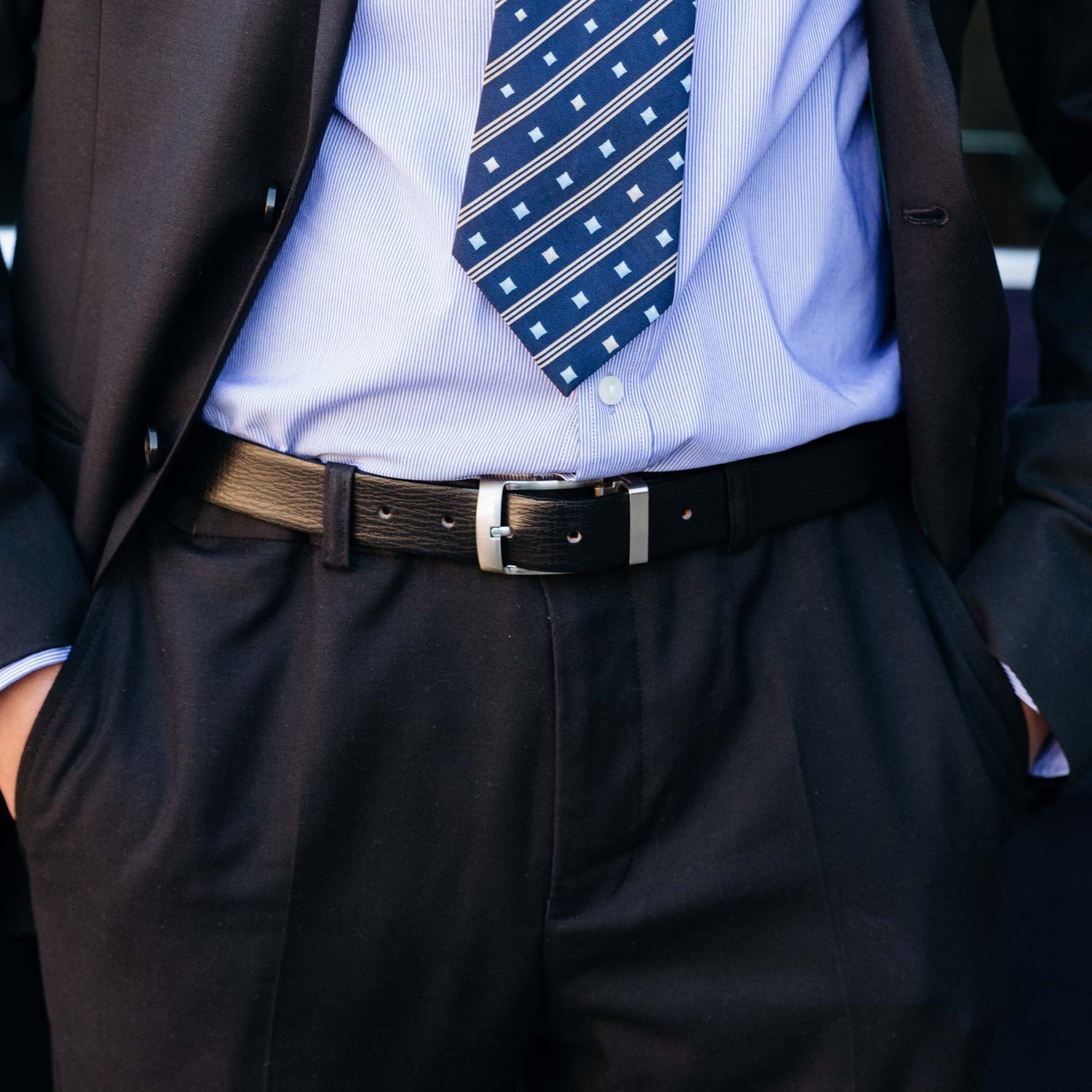 Crafted from smooth leather, this reversible belt is the definition of versatility. Black on one side and brown on the other, this essential belt will keep you looking sharp with almost any suit. At 30 mm (1.2") wide, this belt is made for formal wear.