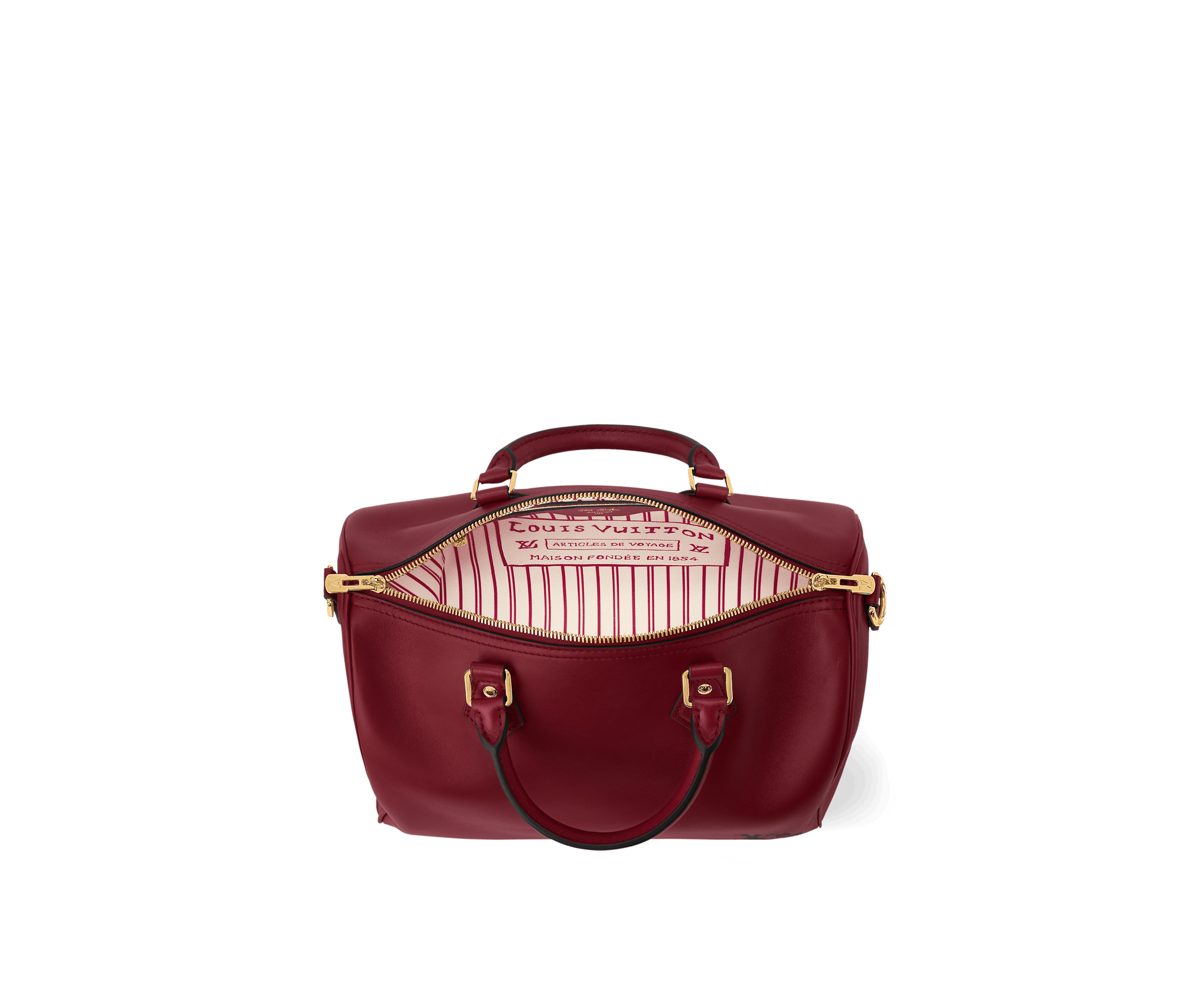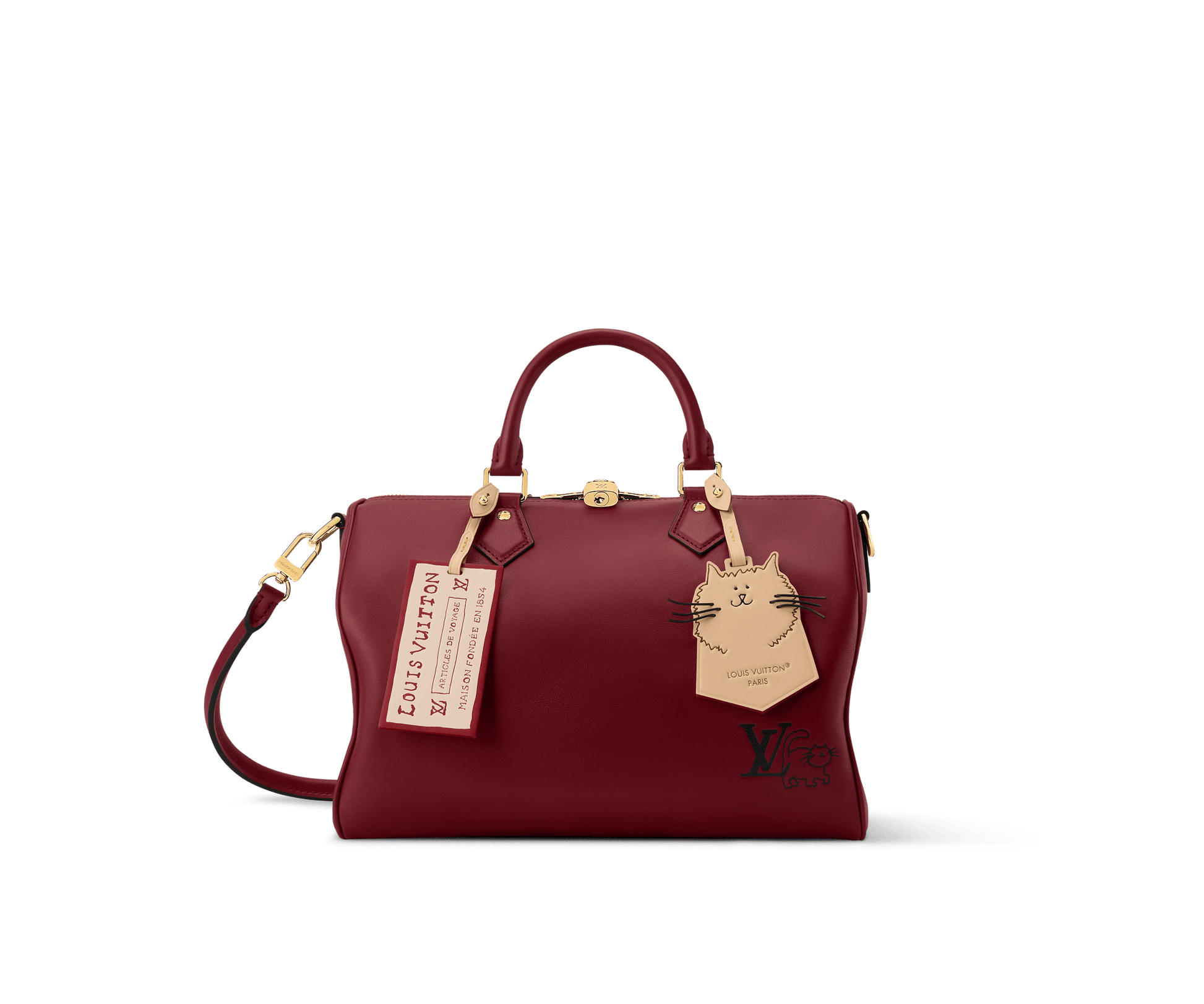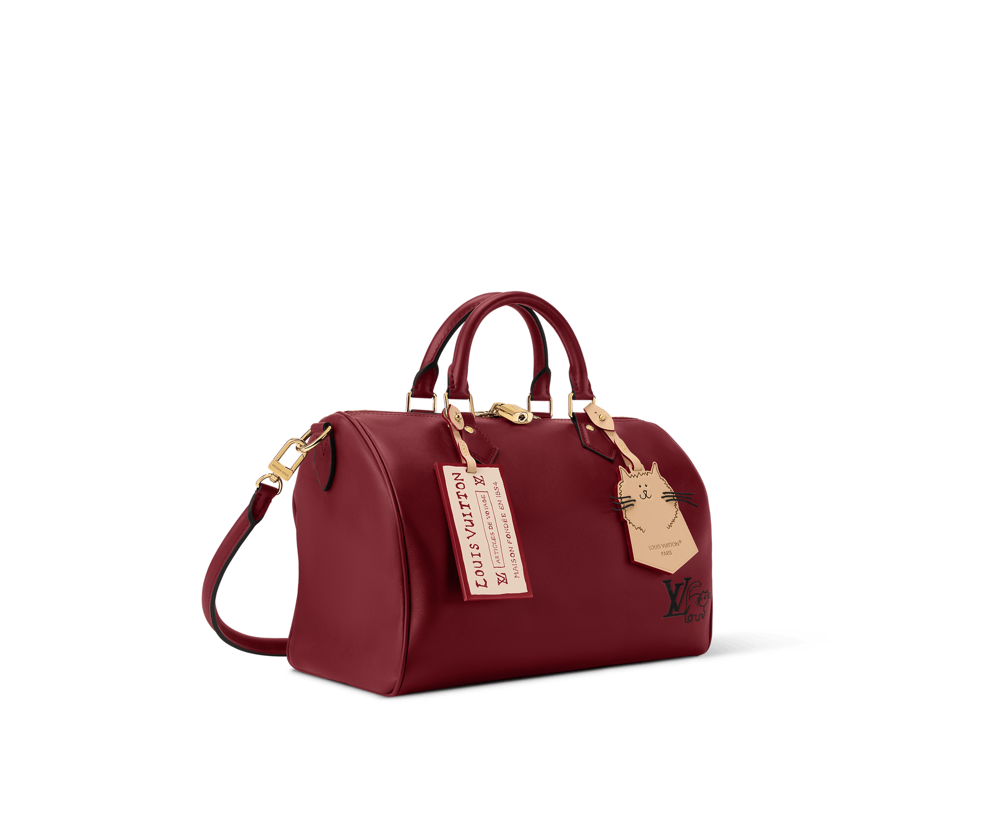 The Speedy Soft 30 is updated for the season as part of the exclusive LV Travels With Grace Coddington collection. It is crafted from calfskin in a Plum shade adorned with gold-toned hardware and a playful cat-shaped key bell. The capacious design also features a removable name tag that is printed with Grace Coddington’s handwriting.