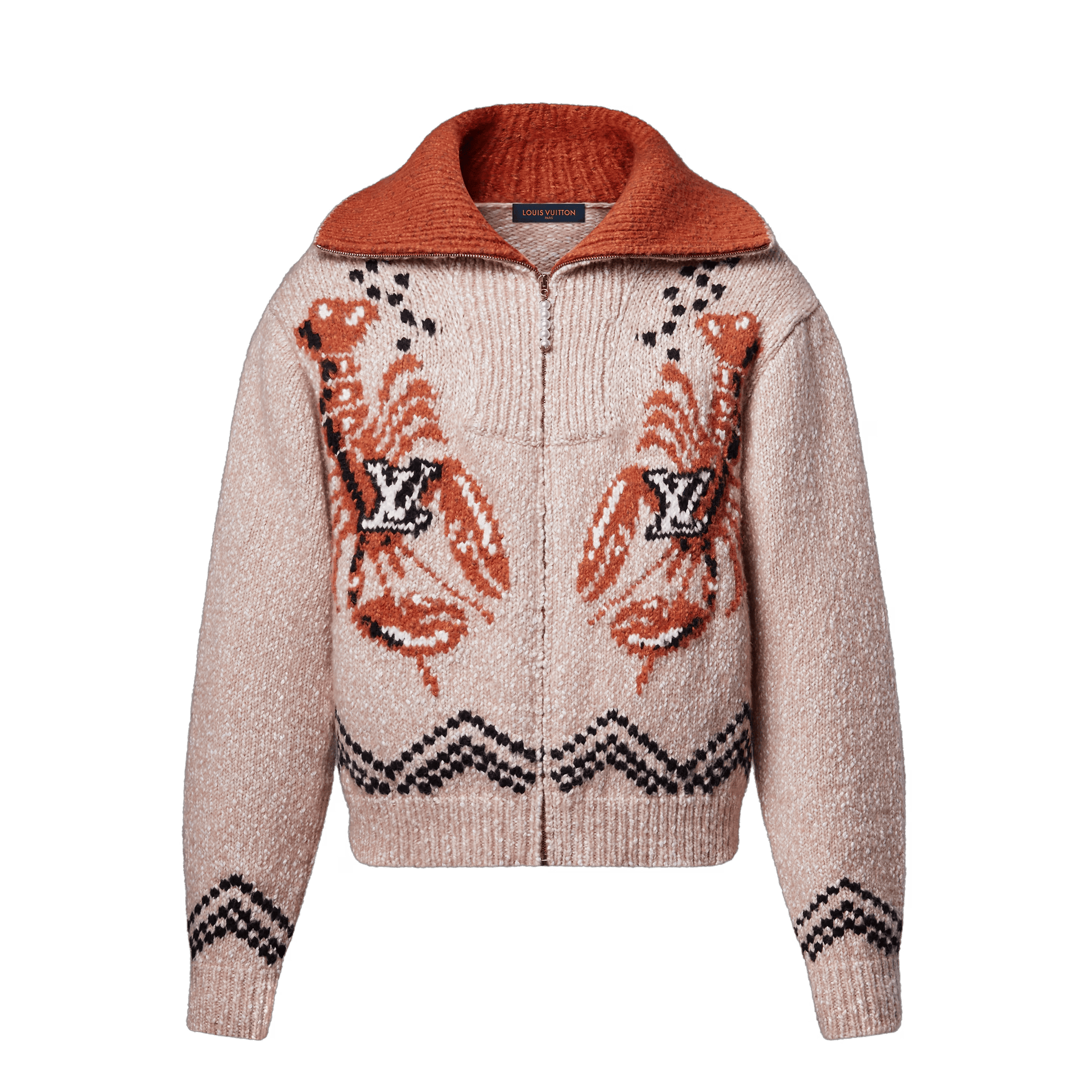 This graphic knitted blouson is adorned with playful intarsia motifs from the Fall-Winter 2025 Pharrell and Nigo collaboration that recall the latter’s Japanese heritage. These include two embroidered lobsters bearing LV signatures on the front and sakura cherry blossom with Japanese signature lettering on the back. A pearl-embellished zipper puller lends a chic finishing touch to this cozy style.